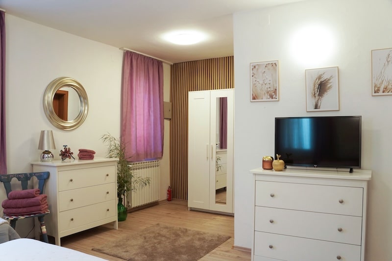 Ljubičasti apartman je prostran apartman s jednom spavaćom sobom površine 45 m2. Smješten je u prizemlju privatne zgrade okružene velikom okućnicom i održavanim vrtom. U spavaćoj sobi se nalazi jedan bračni i jedan jednostruki krevet. Blagavaonica, dnevni boravak i kuhinja su jedna prostorija u kojoj se nalazi jedan dodatni ležaj. Kuhinja je opremljena svim priborom i posuđem, mikrovalnom pećnicom, hladnjakom, štednjakom s četiri kola i pećnicom. Kupaonica je prostrana i ima zidanu tuš kabinu. U oba naša apartmana se pristupa vrlo lako jer su u prizemlju, ali nisu službeno prilagođeni osobama s teškoćom u kretanju. Ipak, mnoge takve osobe odabiru naš smještaj radi okruženja i jednostavnosti. Parking se nalazi doslovno pred samim ulaznim vratima apartmana, a ulazi se uspinjanjem preko samo jedne stepenice. Gostima je na raspolaganju besplatan bežični internet, te TV u spavaćoj sobi. Apartman je također i klimatiziran. U svim našim smještajima je zabranjeno pušenje. Pušiti se može ispred apartmana, gdje se nalazi manji stol i stolice.